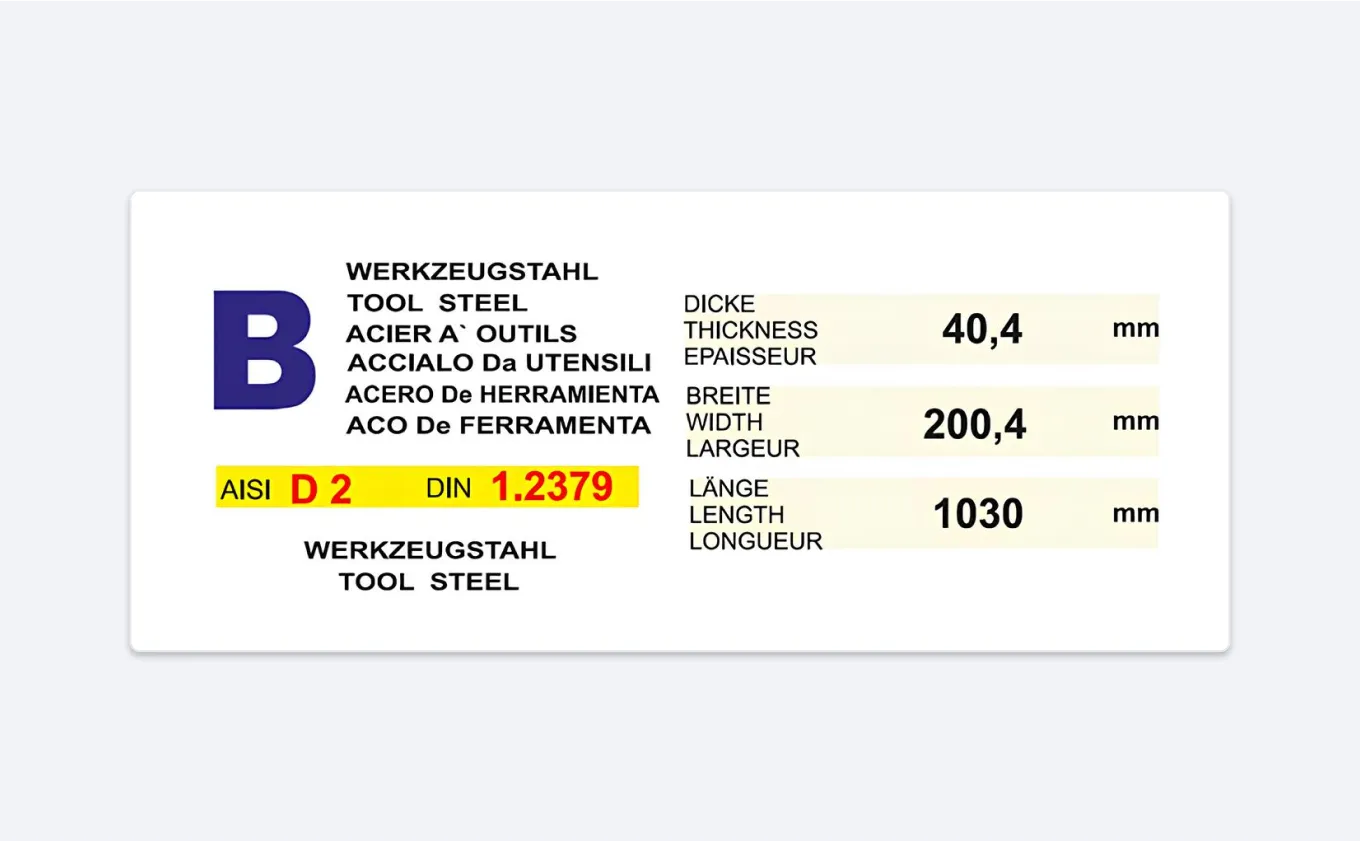 Alle unsere Stähle sind farblich makiert und auf der Verpackung mit einem Aufkleber versehen, wie weiter unten abgebildet. Anhand der Kodierung können wir den gelieferten Stahl bis zur Schmelz-Nummer rückverfolgen. Wir empfehlen daher unseren Kunden die Aufkleber mit der Kodierung aufzuheben.